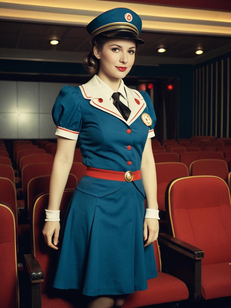 Full-body portrait of a woman dressed in a retro-style cinema usherette costume standing in a movie theater. The costume includes a teal blue dress and matching hat with white and red trim, complemented by a white collar, red bow tie, and knee-high white socks. The setting features red cinema seats and a dimly lit interior with a vintage atmosphere.
