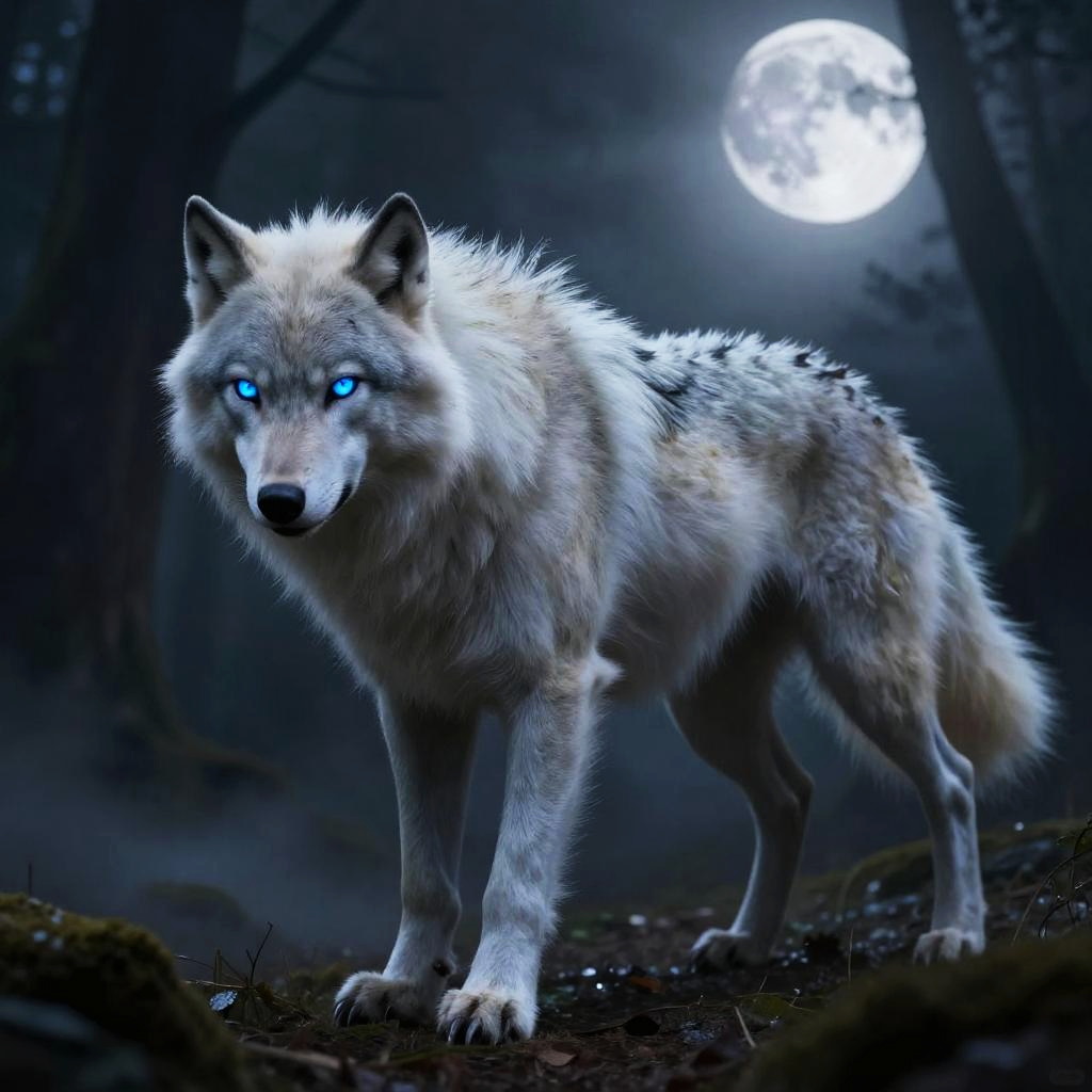 Black wolf symbolism depicted as a majestic wolf standing under a full moon, surrounded by dark forest, mystical glowing eyes, tribal patterns, fantasy art style.