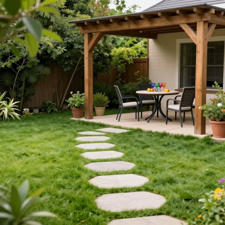 Lush green lawn surrounds a charming patio featuring a hexagonal stone pathway interspersed with grass, leading to a wooden pergola that provides shade over a cozy outdoor dining set with four chairs and a round table adorned with colorful glassware and fruit.