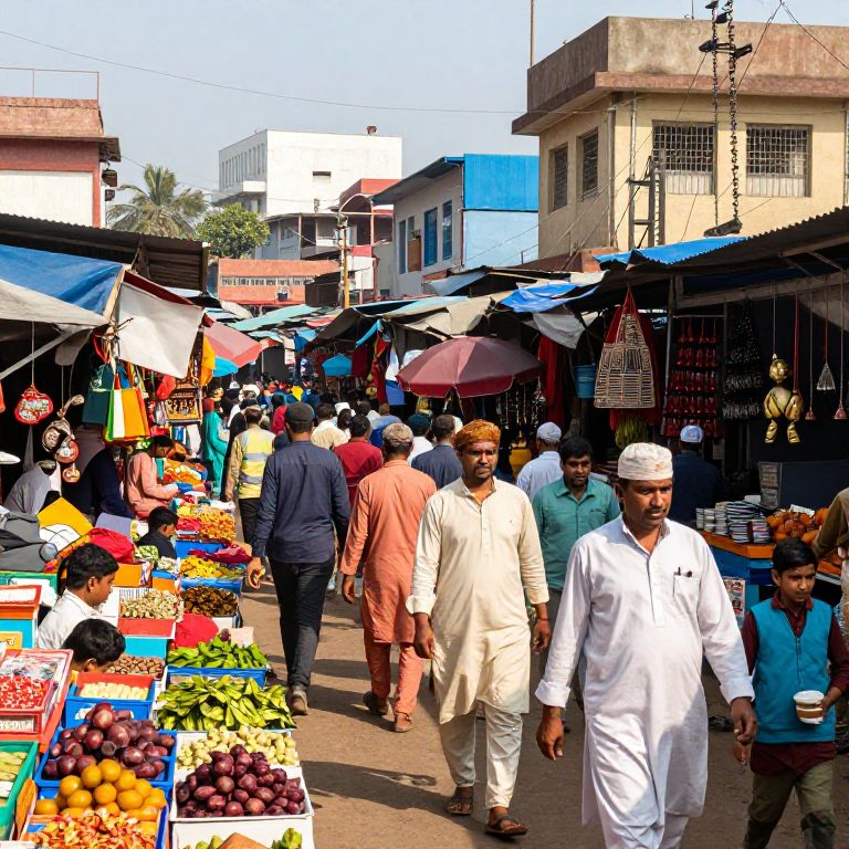 Jamshedpur bustling market scene, colorful stalls with local produce and crafts, lively crowd in traditional clothing, dynamic perspective capturing the essence of a vibrant Indian industrial town, bright daylight, detailed textures.