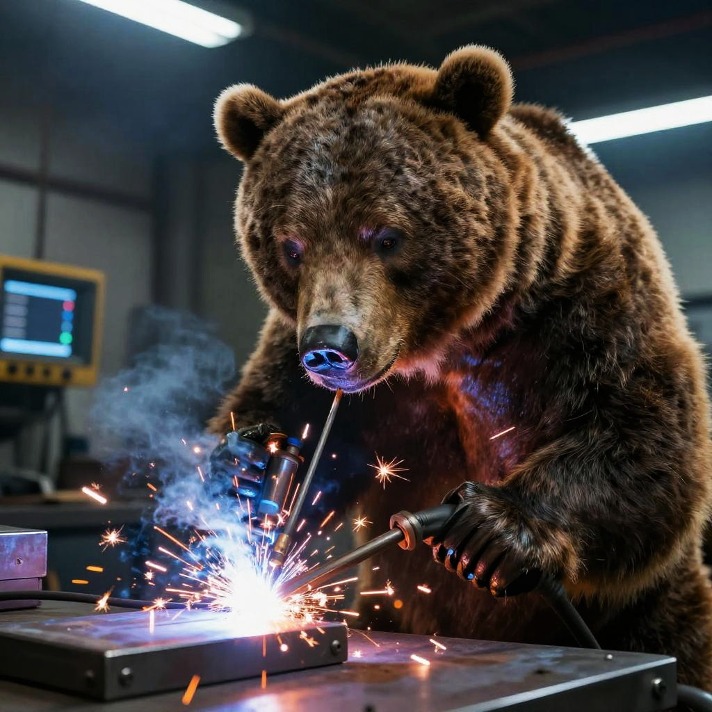 Photograph of a large brown bear with dense fur, welding sparks flying, using a welding torch in a dimly lit workshop.