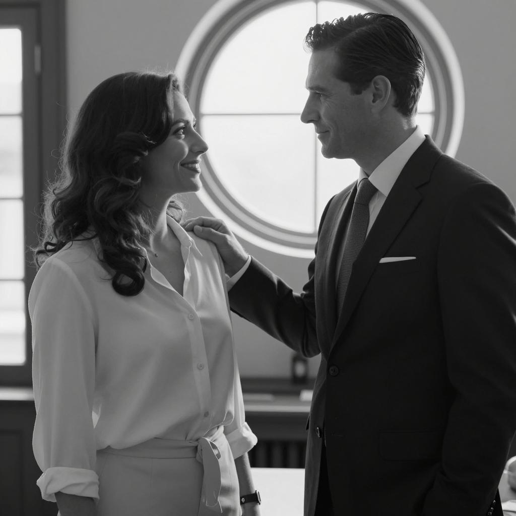 Black-and-white photograph of a man and woman in close profile. Woman on left, short wavy hair, light-colored dress. Man on right, slicked-back hair, dark suit, white shirt. Intense expressions, faces close. Blurred background, indistinct figures.