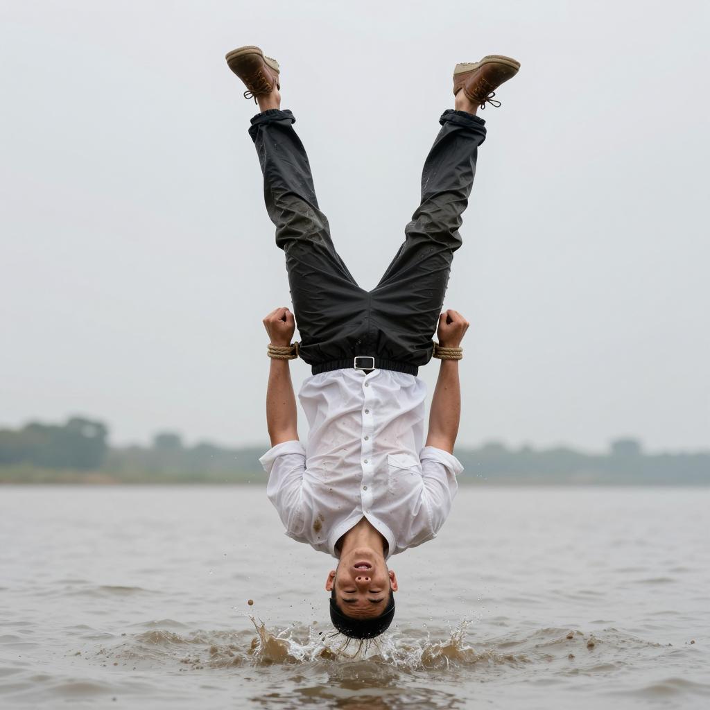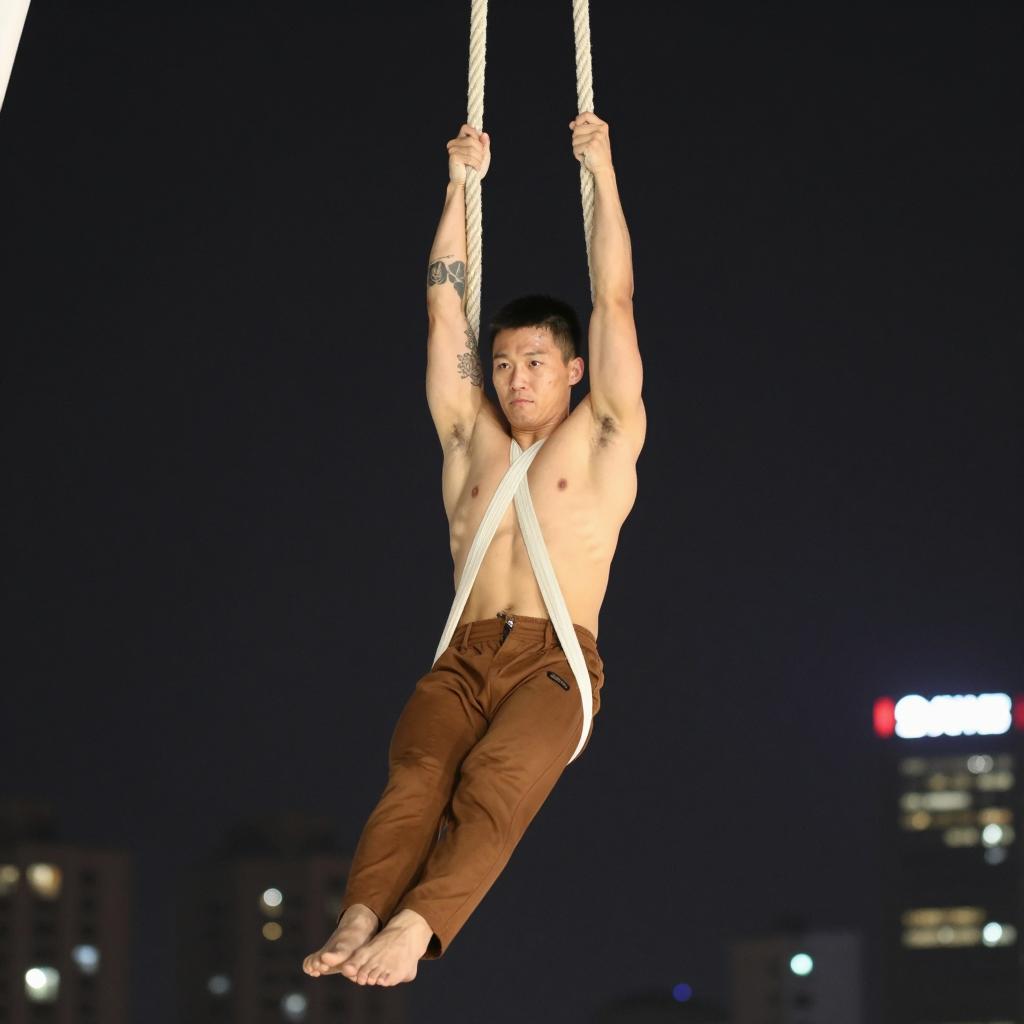 A male aerialist performing at night. He has short, dark hair and tattoos on his right arm. He is shirtless, wearing brown pants and a white strap across his chest. He holds a rope with both hands, hanging mid-air. The background is a blurred cityscape with bright lights. His facial expression is focused and intense. The rope is centered in the image.