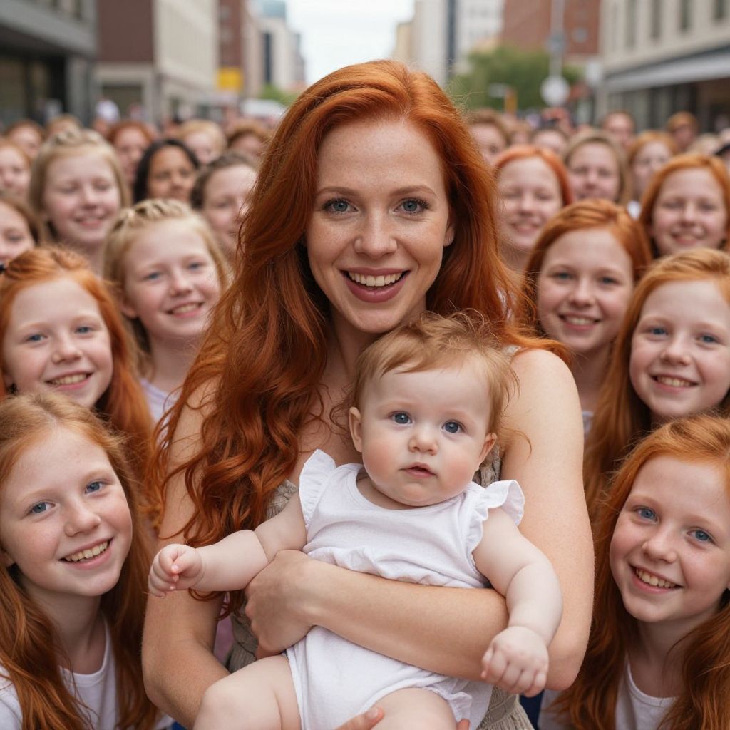 (masterpiece, best quality:1.5), (ultra realistic:1.5), (8k uhd, very high quality:1.5), (extremely detailed face:1.5), (dark skin mother holding her infant girl and surrounded by an endless number of her young children:1.5), (everyone has ruby red hair:1.5), (everyone smiling and happy:1.5), (everyone has bright blue eyes:1.5), (everyone has long ruby red hair:1.5), (the woman is surrounded by endless numbers of her young children that fill the entire background:1.5), (the woman is surrounded by an endless number of her young children that fill the entire background:1.5), (everyone has long ruby red hair:1.5) (city background:1.5)