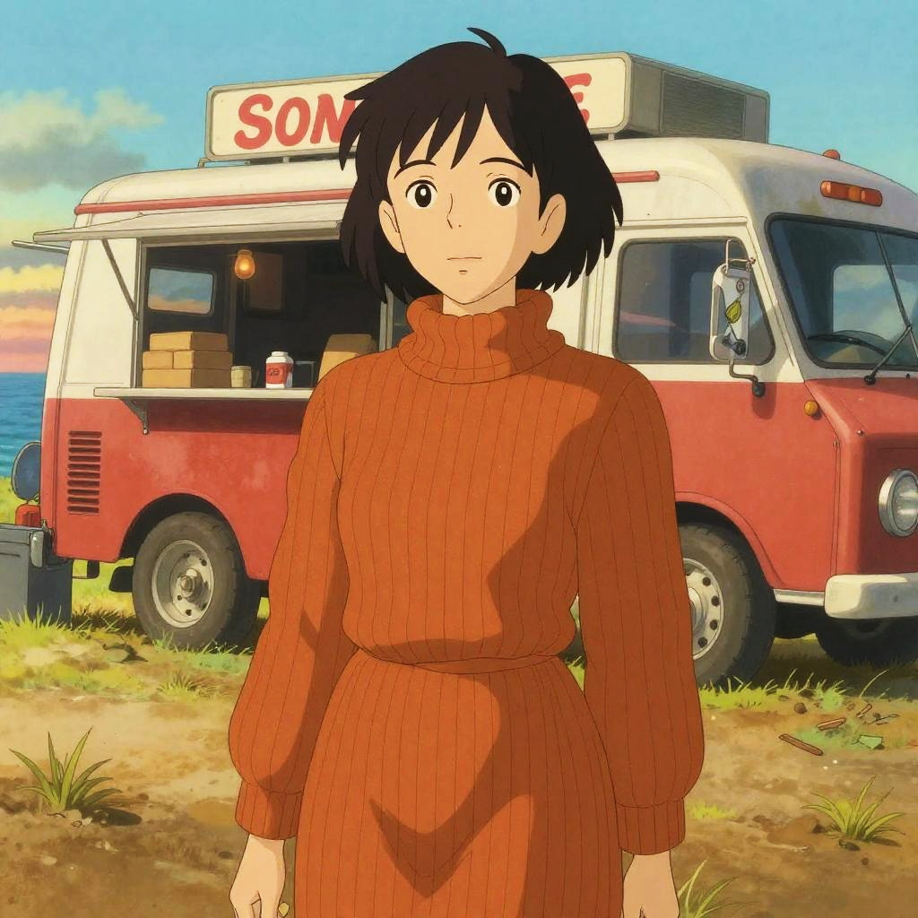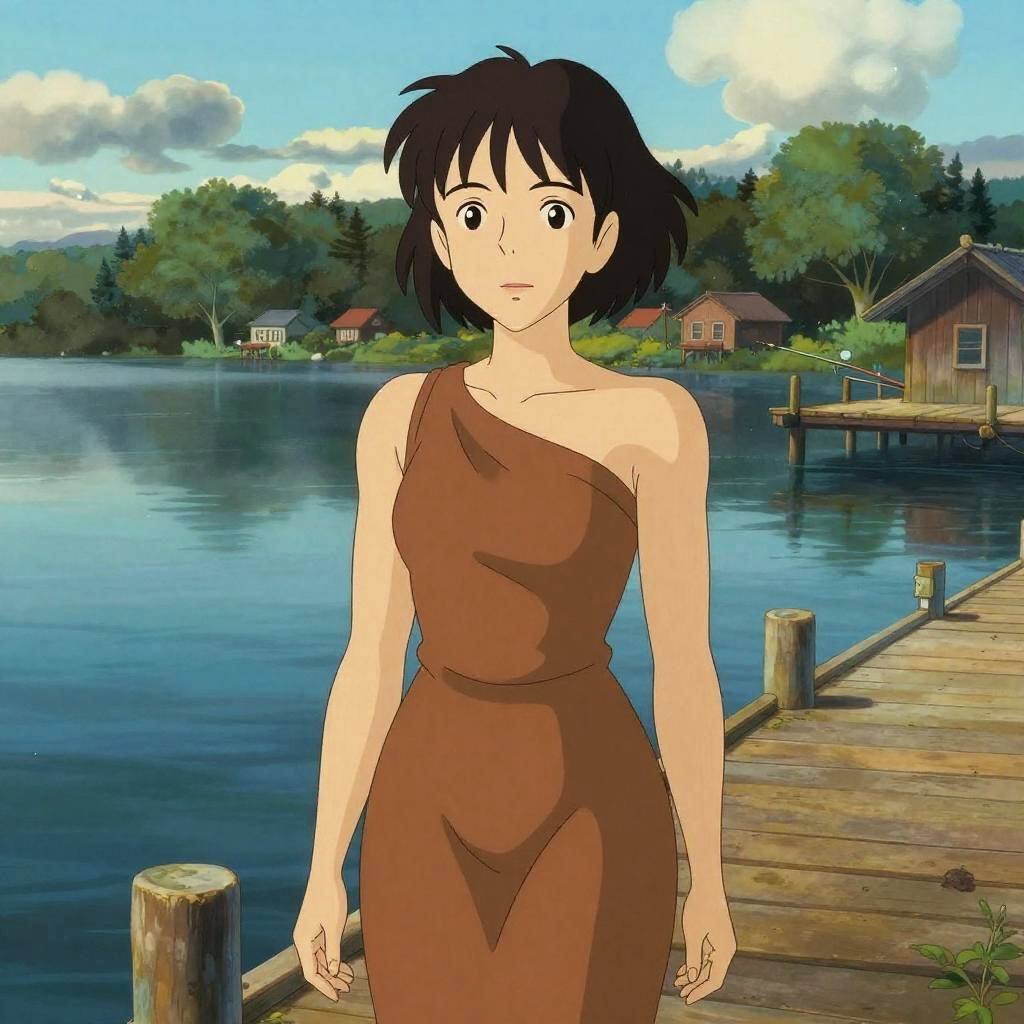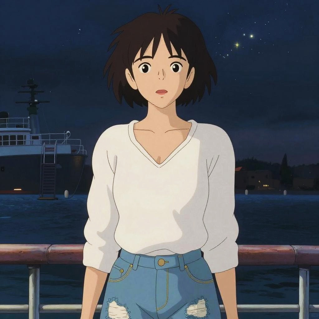A Hourglass woman in a Studio Ghibli style, wearing a deep teal blouse with a lace-up neckline and high-waisted dark denim jeans, seated at a rooftop dining table with a panoramic view. Sexy. Pretty face and beutiful eyes