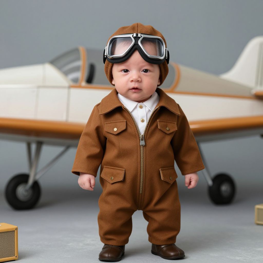 Photograph of an adorable baby standing in front of a small, vintage white and wooden airplane. The baby, with fair skin and chubby cheeks, wears a brown aviator jumpsuit with a zipper, white shirt, and brown shoes. He also has brown aviator goggles with white lenses on his head. The background is a simple, light gray studio setting. The airplane's wheels are visible, and a small yellow box is on the ground to the left. The baby's expression is neutral, and the overall scene has a nostalgic, aviation theme.