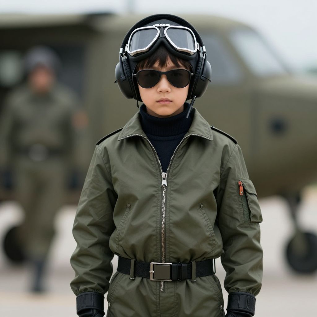 "Newborn Pilot Costume Fancy Dress, boy in a brown jacket and goggles standing in front of an airplane"