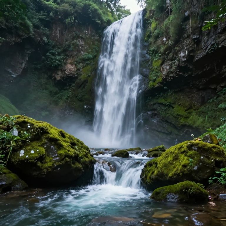 Photograph of a lush, tropical waterfall cascading down a dark, rocky cliff surrounded by dense greenery. The water flows rapidly over moss-covered rocks in the foreground, creating a misty spray. The waterfall's white, frothy stream contrasts with the dark, textured rocks and vibrant green moss. The background reveals a forest canopy with sunlight filtering through, illuminating parts of the waterfall. The water in the foreground is clear, reflecting the greenery and rocks. The overall scene exudes a sense of natural tranquility and untouched beauty.