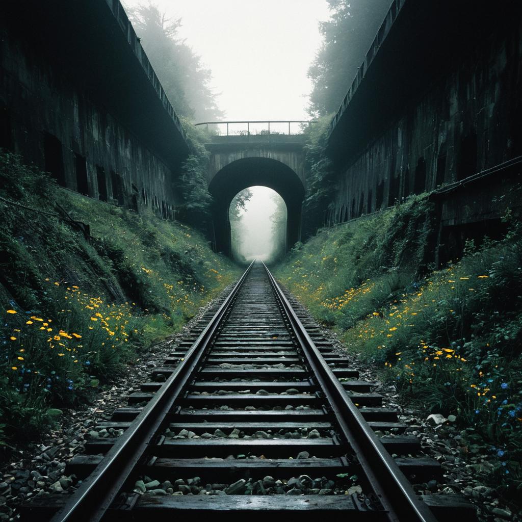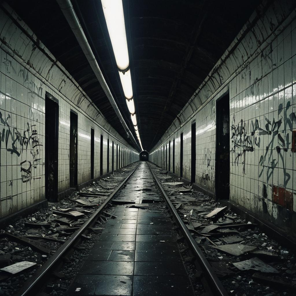 Ultra-Wide Angle A mesmerizing, high-resolution photograph capturing the haunting stillness of an abandoned subway tunnel, expertly plays with contrasts, guiding the viewer's gaze along the tunnel's seemingly endless path, ultimately leading to the bright, inviting light at the end. The composition is further enhanced by the cracked tiles, strewn debris, and faint graffiti on the walls, which draw the viewer deeper into the scene. This mysterious, intriguing landscape resonates with viewers, reminding them that even in the darkest moments, there is always a glimmer of light waiting to be found.