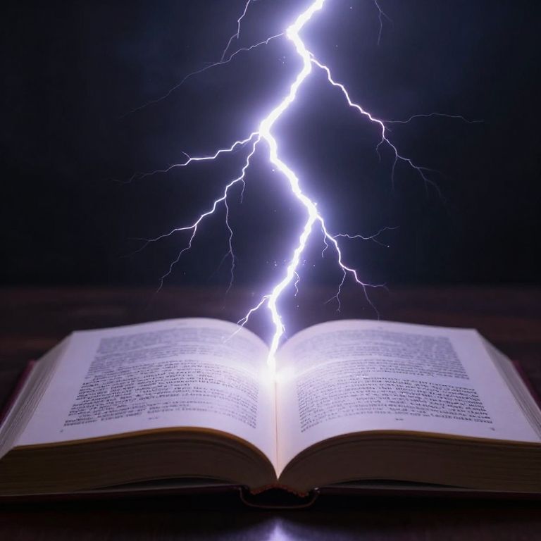 A radiant bolt of lightning emerges from the pages of an open book, illuminating its contents with ethereal light, as if the storm itself has been harnessed to reveal hidden truths within the text.