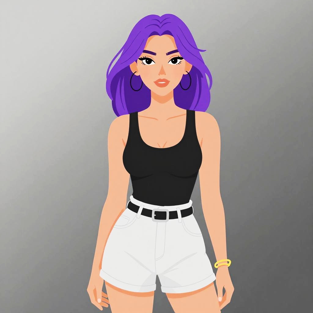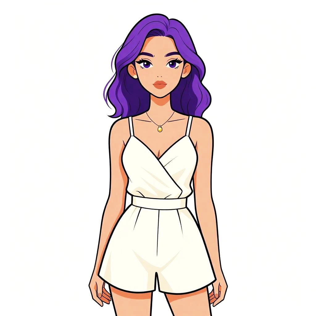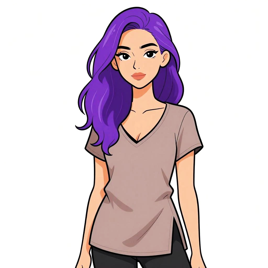 Woman with pretty face and pretty hair. Woman, casual contemporary, loose-fitting, short taupe tunic, deep V-neck with black strap detail, short sleeves, high side slits, plain fabric, white studio background. --sref 1461