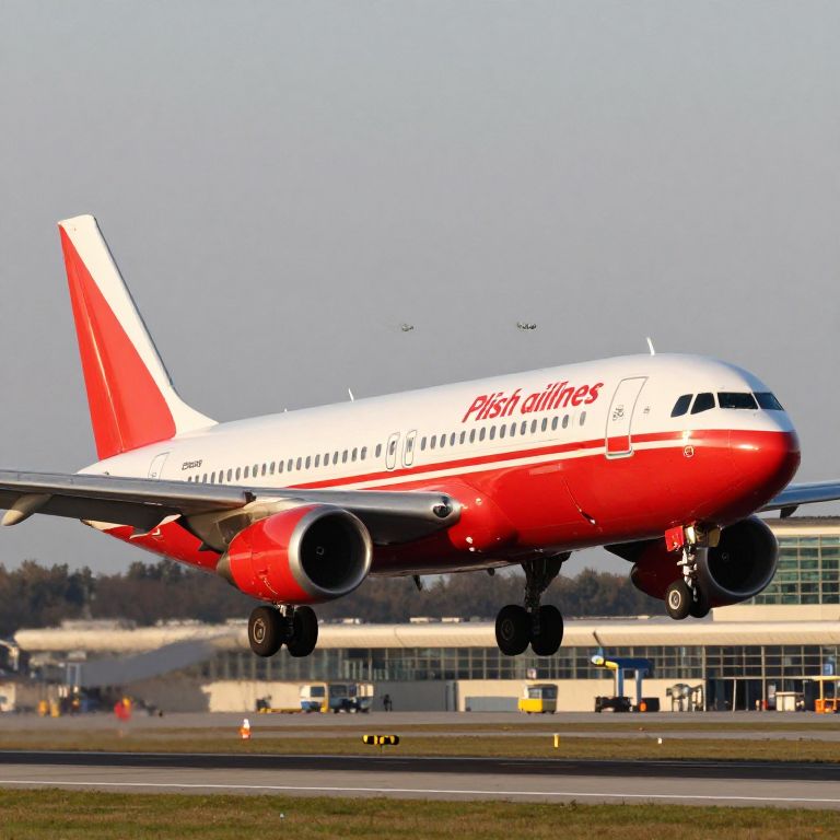 Polish airlines flight 5055 landing at an old European airport, classic aircraft with red and white colors, evening light, detailed airport terminal background