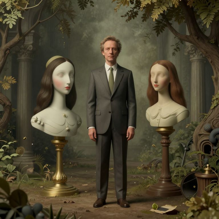 Photograph-like digital artwork featuring a middle-aged man with grey, wavy hair and a serious expression, wearing a black suit and green tie, standing between two classical-style porcelain busts of women with long brown hair and pale skin. The man is centered, with the busts on either side, each on a golden and brown pedestal respectively. The background is a lush, overgrown garden with ancient, weathered stone pillars, green foliage, and a small, antique gramophone on the right. The image has a surreal, Victorian atmosphere with rich textures and muted colors.