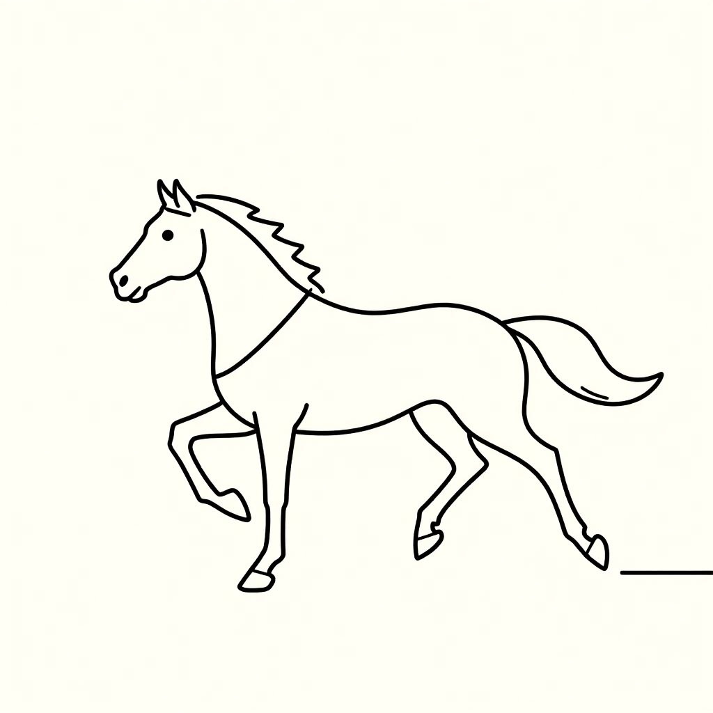 Continuous line drawing generator illustrating a sleek running horse with one fluid uninterrupted black line on cream background, capturing motion and grace in simple minimalist style, artistic and dynamic with emphasis on curves and flow.