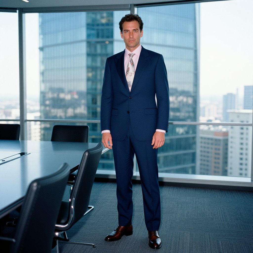A man, midnight blue Italian suit, pale pink dress shirt, floral silk tie, glossy dark brown leather monk strap shoes, modern glass skyscraper, sleek conference room, panoramic city views, AgfaColor film, confident expression, poised demeanor. Man has masculine face and piercing eyes