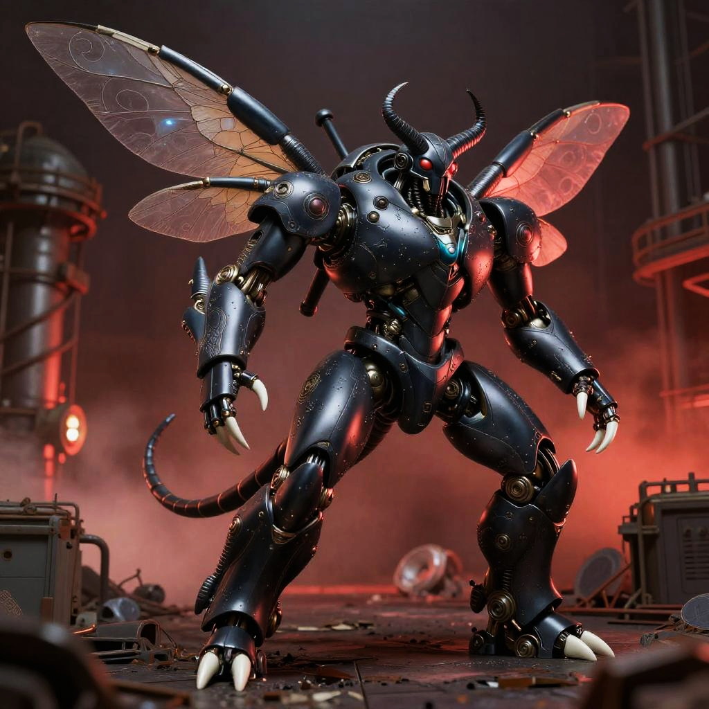 Anthro matte onyx beetle automaton, ((lineart)), membranous wings, horns, tail, red eyes, white claws, muscular solo, standing, fighting stance, huge mecha presence, no humans, science fiction, abandoned plasma refinery, dramatic low side angle, pwide shot, smoky red ambient lighting, 8k wallpaper, RAW photo, best quality, masterpiece, realistic, photo-realistic, mecha (mjstyle), (robot:1.5), (porcelain materials:1.6), (polished metal:1.4)