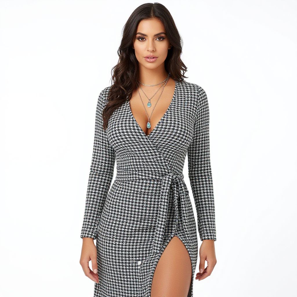 "Woman, contemporary casual, V-neck wrap dress with a black and white houndstooth pattern, long sleeves, thigh-high slit, cinched at the waist with a fabric tie belt, layered pendant necklaces, white studio background. Sexy. Pretty face and beаutiful eyes. Big breasts."