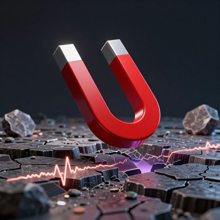 A surreal 3D render depicts a colossal red magnet hovering above a fragmented tectonic plate, symbolizing the invisible forces dictating seismic movements and evoking a cyberpunk aesthetic with dramatic lighting and high-definition detail.