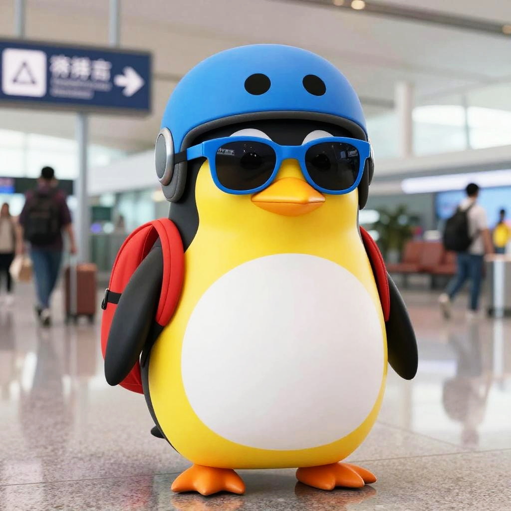 Photograph of a cartoon penguin standing in a brightly lit airport terminal. The penguin has a yellow body with a white belly, orange feet, and black flippers. It wears a blue helmet, blue sunglasses, and a red backpack. The background features a blurred sign with Chinese characters and an arrow, as well as indistinct figures and luggage. The penguin's smooth, plastic-like texture contrasts with the shiny, reflective floor. The overall style is playful and vibrant, emphasizing the penguin's colorful, whimsical appearance.