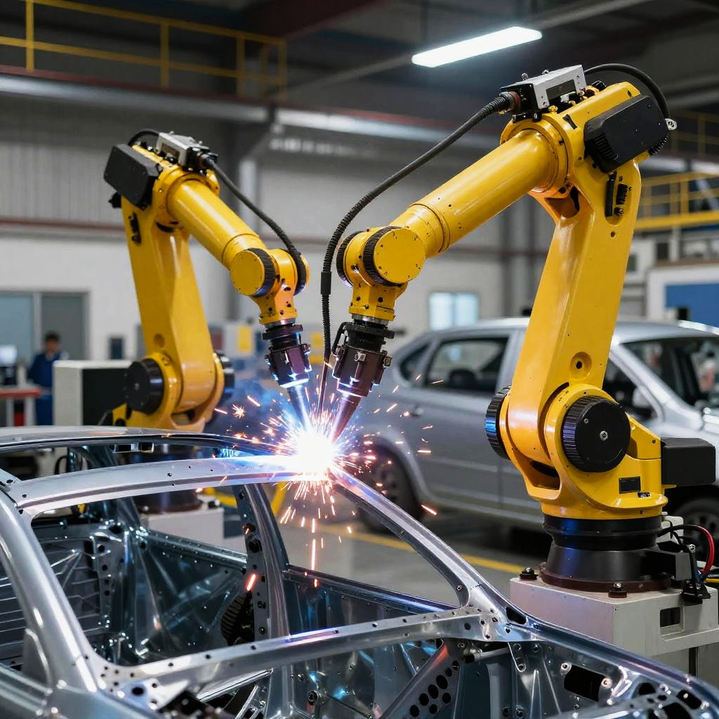 Close-up industriefoto of robotic arms welding car frames in a sleek automotive plant, sparks flying, precision and technology in sharp focus, futuristic industrial setting, high detail, realistic shadows and reflections emphasizing the machinery.