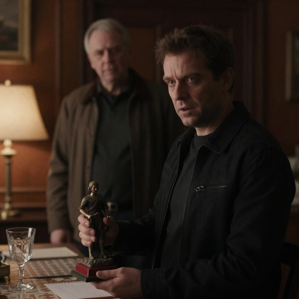 Photograph of a dimly lit room with two men. Foreground man with short brown hair, black jacket, holding a small, detailed statue with a red base. Background man with short gray hair, brown jacket, standing. Wooden paneling, table lamp with beige shade, glass items, patterned tablecloth. Foreground man's intense expression.