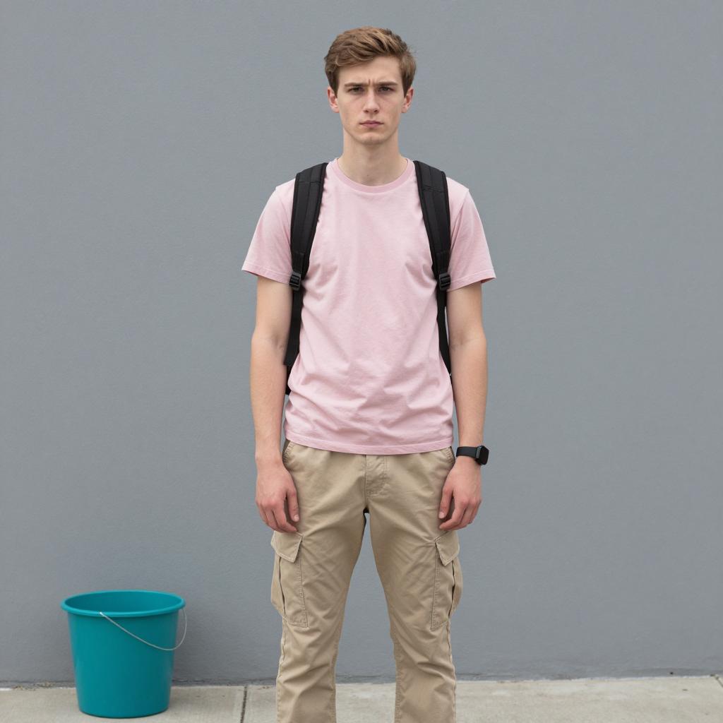Casual outfit khaki pants, photograph of young man standing, casual outfit, pink t-shirt, beige cargo pants, black watch, black backpack, short brown hair, light skin, serious expression, outdoor setting, grey wall background, teal bucket on ground, natural light, daytime, front view