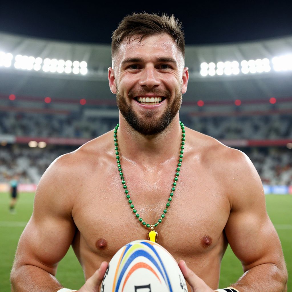 Photograph of a muscular, bearded man with short brown hair, smiling widely while holding a rugby ball. He's shirtless, wearing a green beaded necklace with a yellow pendant. His skin is tanned, and he has sweat on his face and chest. The background is a brightly lit rugby stadium with blurred lights and spectators. The image has a vibrant, high-contrast style.
