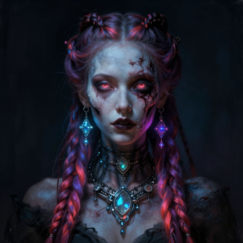 Digital fantasy portrait of a pale, blue-lit woman with red and purple braided hair, glowing red eyes, dark lipstick, and intricate jewel-