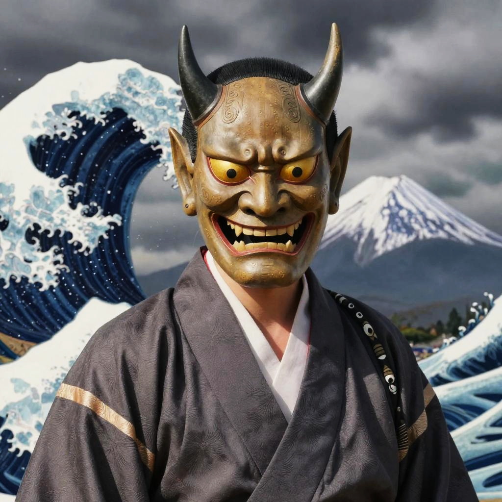 Ukiyo e oni showing a menacing grin, detailed textures on demonic mask, traditional Japanese garments, stormy sky backdrop, stylized waves and Mt. Fuji in distance