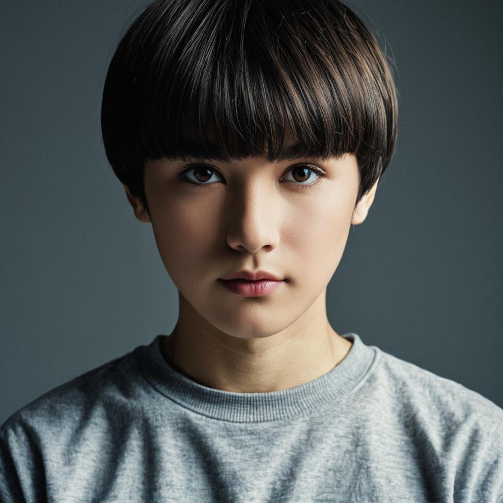 Ured bowl cut hairstyle,1boy, solo, male focus, realistic, looking at viewer, shirt, upper body, brown hair, closed mouth, short hair, grey shirt, black hair