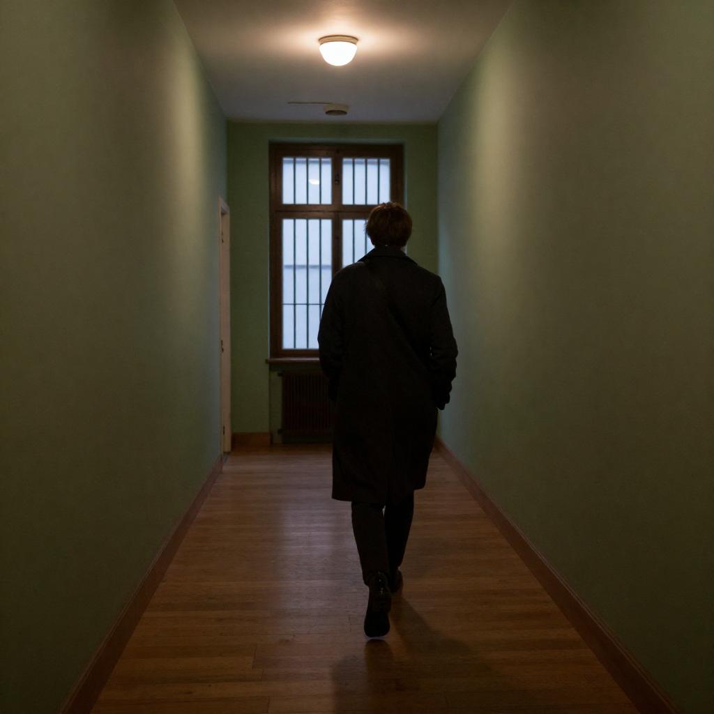 A photograph of a dimly lit indoor hallway with green walls and a wooden floor. A person with short brown hair, wearing a long dark coat and black shoes, is walking away from the camera toward a window with barred glass at the end of the corridor. The hallway is illuminated by ceiling lights.