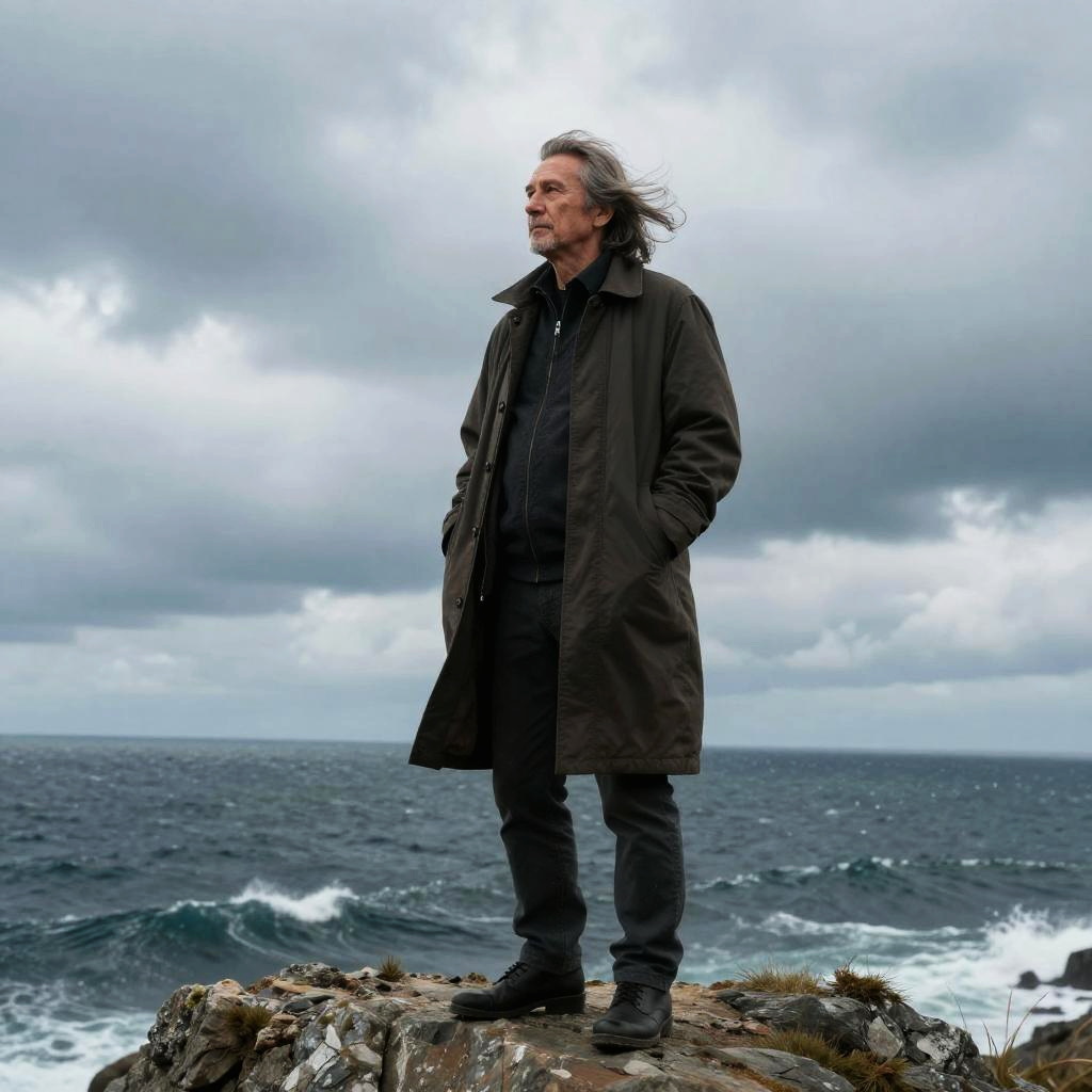 60 year old man with long hair standing on a rocky cliff overlooking the ocean, windswept hair, contemplative expression, wearing a long coat, dramatic cloudy sky background