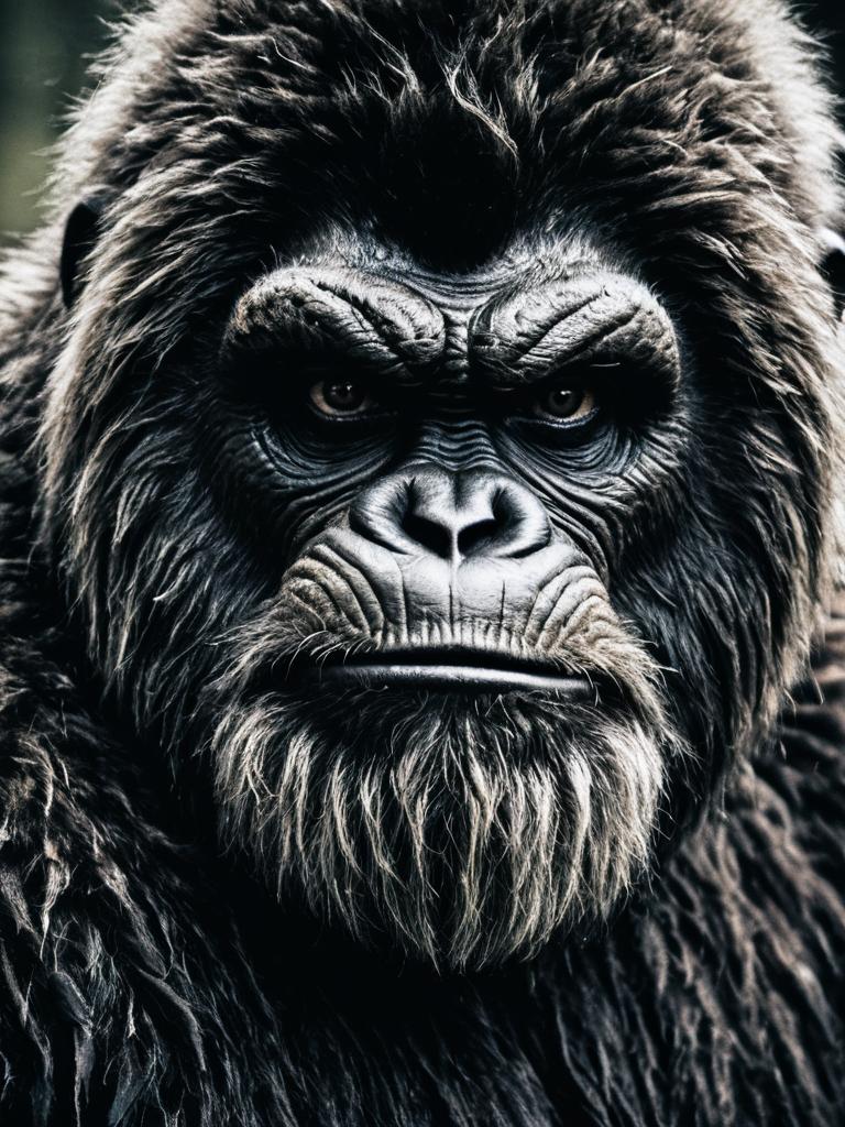 Man in Bigfoot Costume, close-up detailed headshot with fur texture