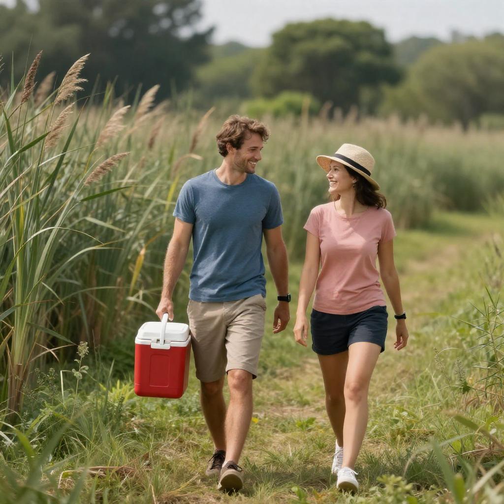 Couple Walking Through Sunny Marsh with Cooler