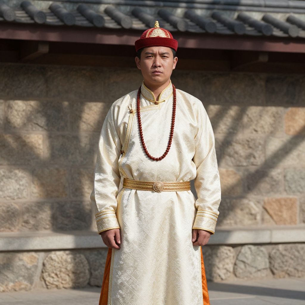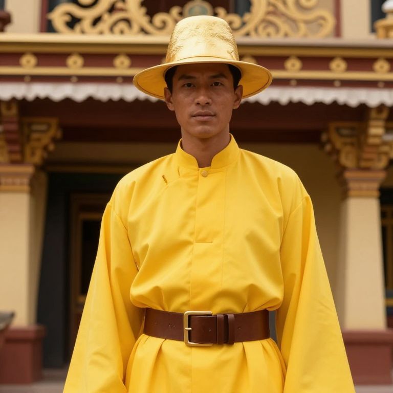 A person is wearing a yellow outfit with a gold hat and a brown belt. The person is standing in front of a building with ornate decorations.