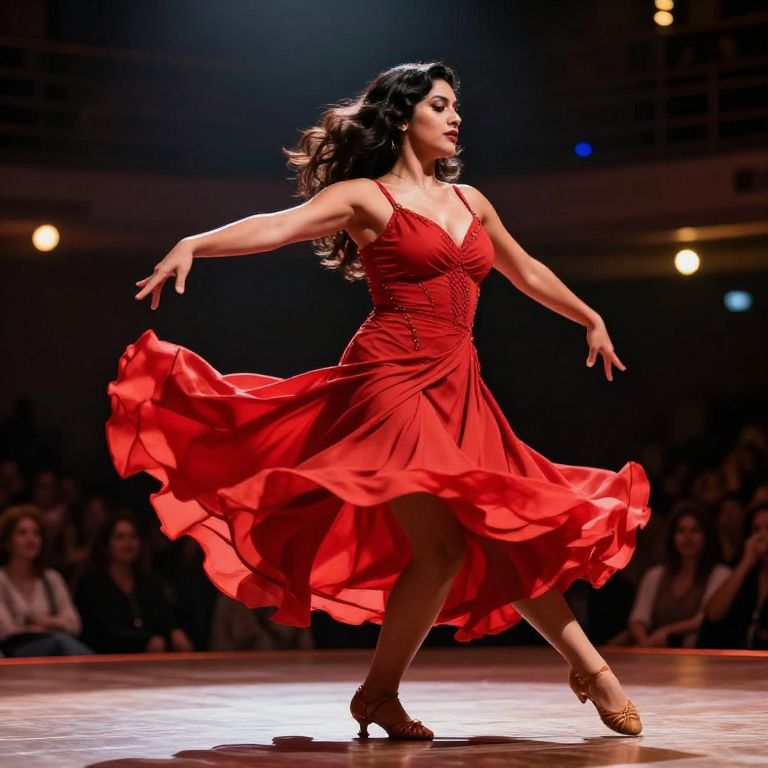 Beautiful thick Latina dancer mid-motion on a dimly lit stage, flowing red dress swirling, muscles toned and graceful, dynamic energy captured in fluid lines, dramatic shadows enhancing depth, background with soft glowing lights and lively audience silhouettes.