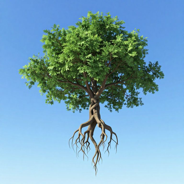 Digital illustration of a lush, green tree with exposed, intricate roots floating against a clear, bright blue sky.