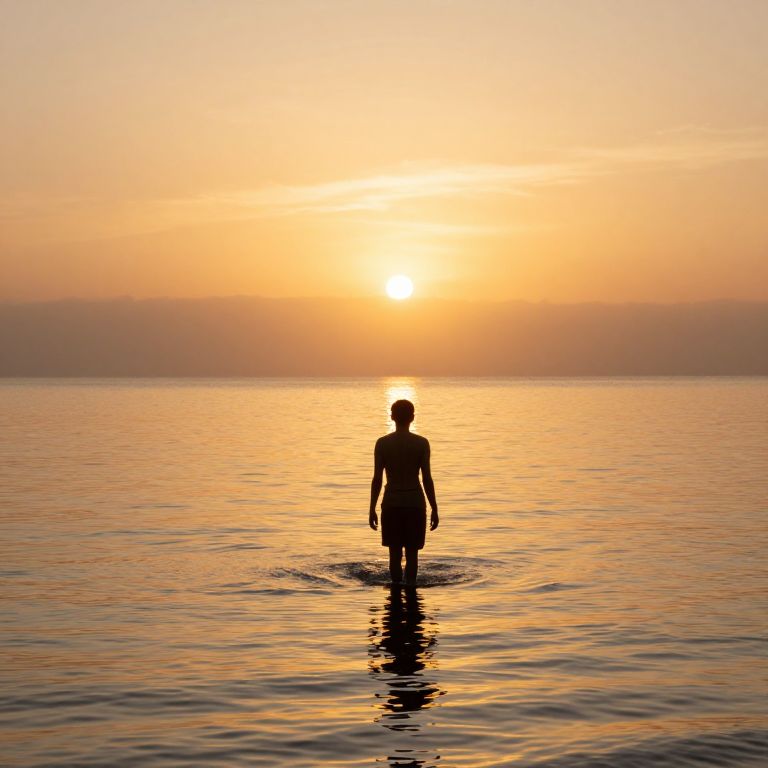 Photograph of a silhouetted person standing in calm, reflective ocean water during a sunset. The person, centered in the image, is seen from behind, with arms relaxed by their sides. The sun, a glowing orb, is low on the horizon, casting a warm orange and yellow gradient across the sky and water. Gentle ripples surround the person's legs. The horizon line is faint, blending into the soft, hazy sky. The overall mood is peaceful and contemplative, with the warm hues of the sunset contrasting against the dark silhouette of the person.