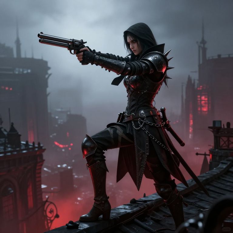 Cyberpunk woman in black leather armor, hooded, aiming gun, standing on rooftop, foggy cityscape with red lights, gothic architecture