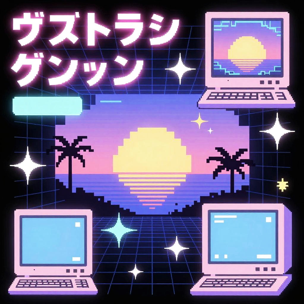 Vaporwave image generator producing an abstract digital collage with a mix of Japanese text, neon-lit grids, pixel art sunsets, vintage computer graphics, and pastel color palette, combining elements of cyberculture and nostalgic 90s internet aesthetics.