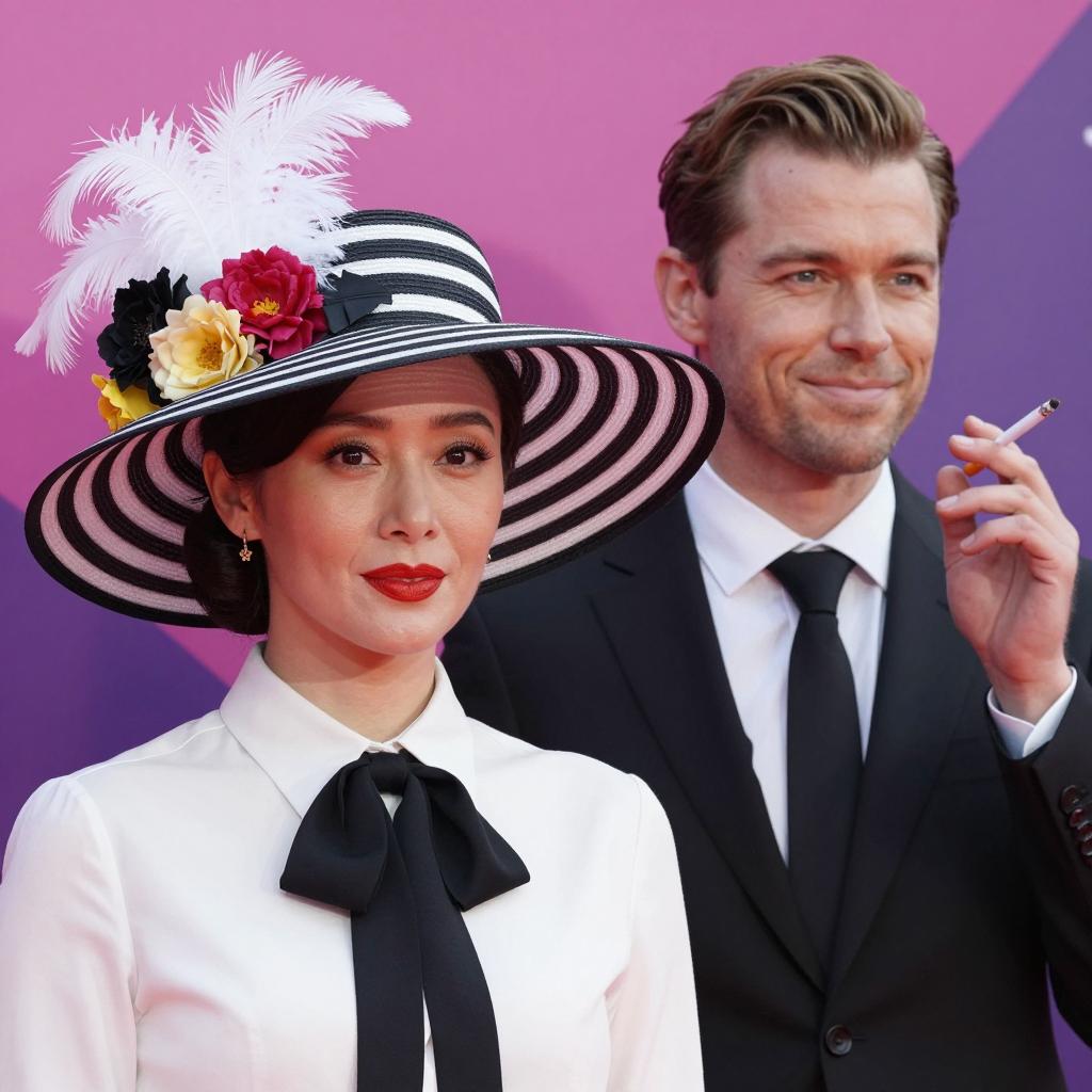 Black and white photograph of a couple. Woman with short dark hair, black earrings, white strapless dress, smiling, leans over man with short brown hair, dark suit, grinning. Man holds woman's waist, she embraces his neck. Dark background. Woman on top, man on bottom. Both smiling intensely.