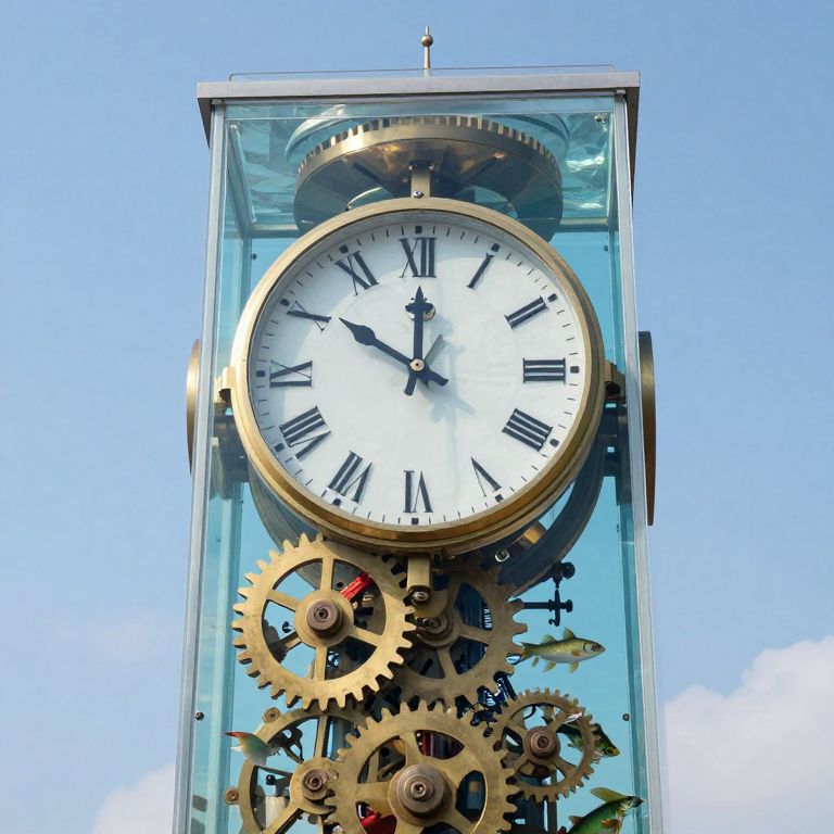 A surreal clock encased in a transparent tower, where mechanical gears intertwine with swimming fish, defying the boundaries between time and aquatic life.