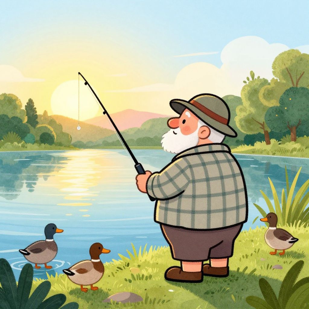 Fat old man cartoon character fishing by a peaceful lake at sunrise, wearing a fishing hat and plaid shirt, surrounded by ducks and tall grass, colorful and whimsical illustration style, soft watercolor textures combined with bold outlines.