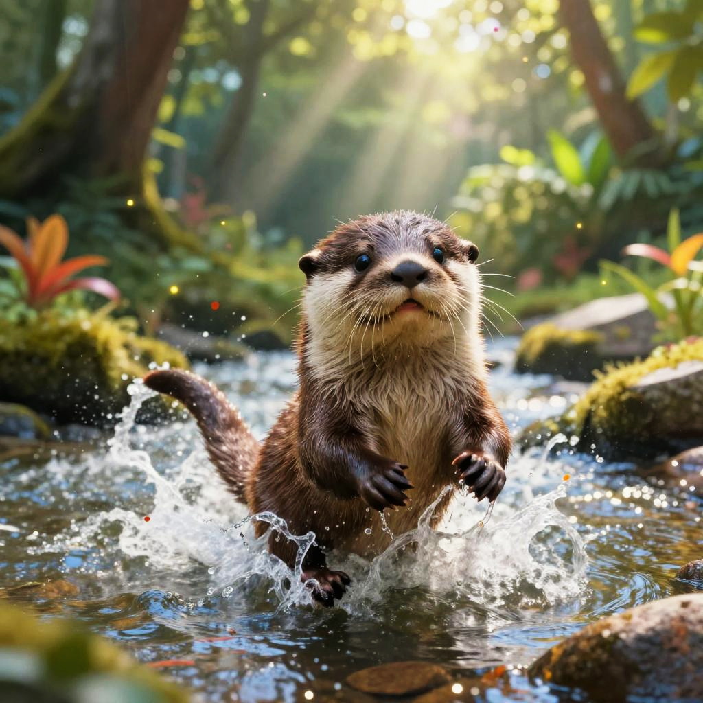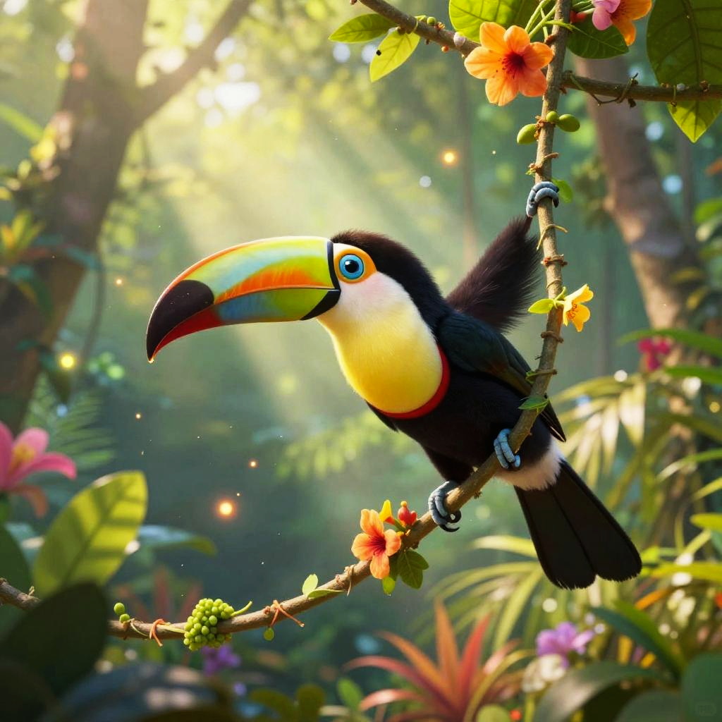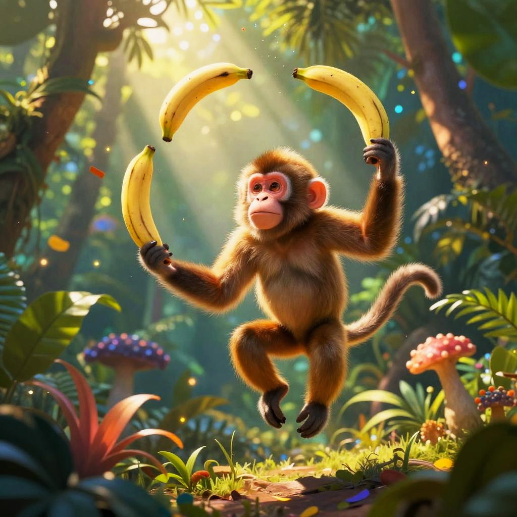 Energetic squirrel balancing on twisting vines in a tropical jungle clearing, bright beams filtering through leaves, playful whimsical atmosphere, exaggerated features, dynamic motion arcs, soft volumetric light, fluttering confetti or drifting fireflies, colorful flora and curious wildlife, crisp focus on the face, shallow depth of field, saturated tropical palette, painterly textures with subtle film grain, cinematic color grade, light bloom on highlights, high clarity, joyful energy, storybook charm, balanced composition, gentle bokeh, fine microdetail