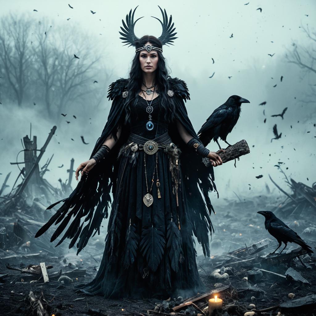 A mystical portrayal of Hecate, the ancient goddess of magic and witchcraft, dressed in a black gown adorned with raven feathers. She wears a crown resembling dark wings and holds a wooden staff with a raven perched on it. The scene is set in a foggy, desolate battlefield scattered with broken enchanted relics and ravens flying in the background, creating an eerie and powerful atmosphere.