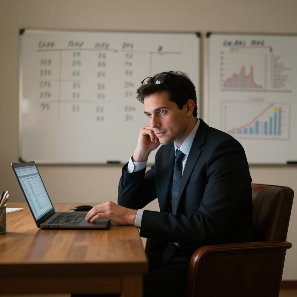 Professional businessman sitting at desk, focused on laptop screen displaying financial data, surrounded by whiteboards filled with numbers, charts, and graphs, ambient soft light illuminating the room, wooden furniture, leather armchair, serene atmosphere, calm expression, confident posture, suit jacket, tie, glasses perched on forehead. Man has masculine face and piercing eyes