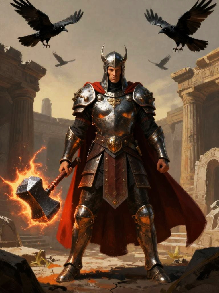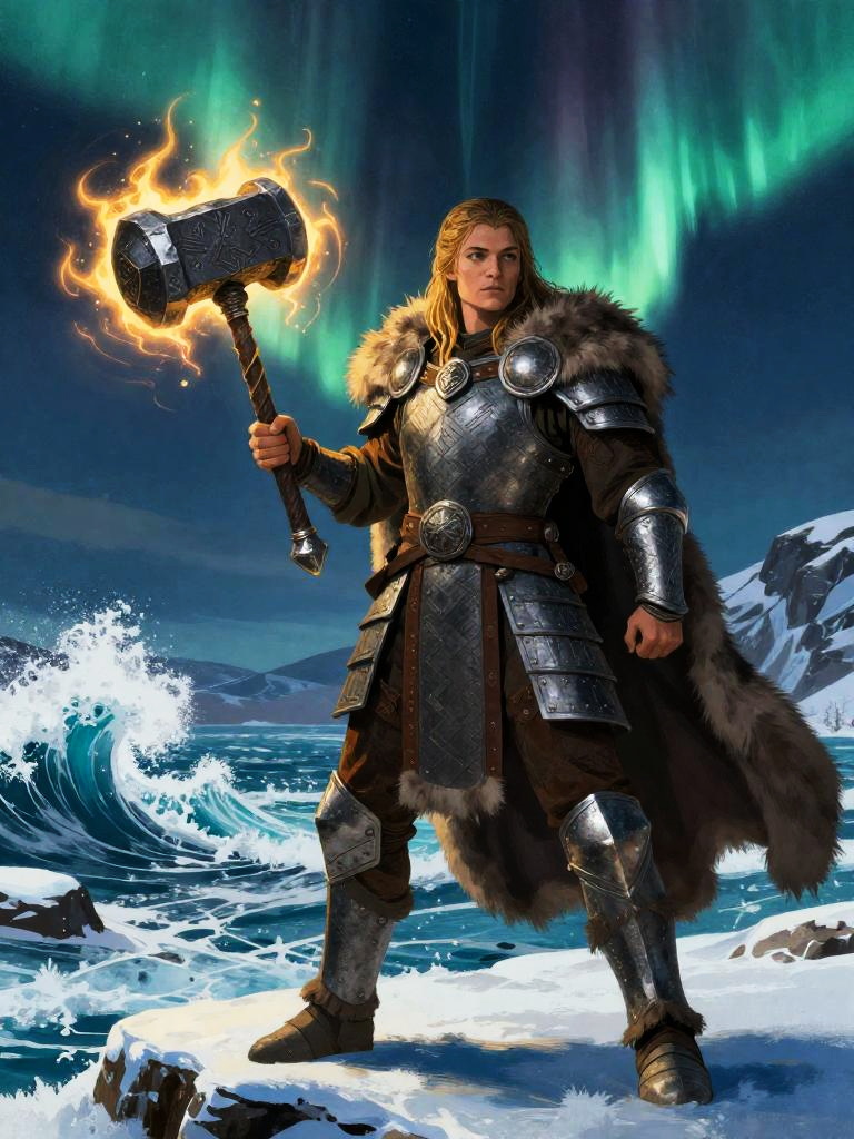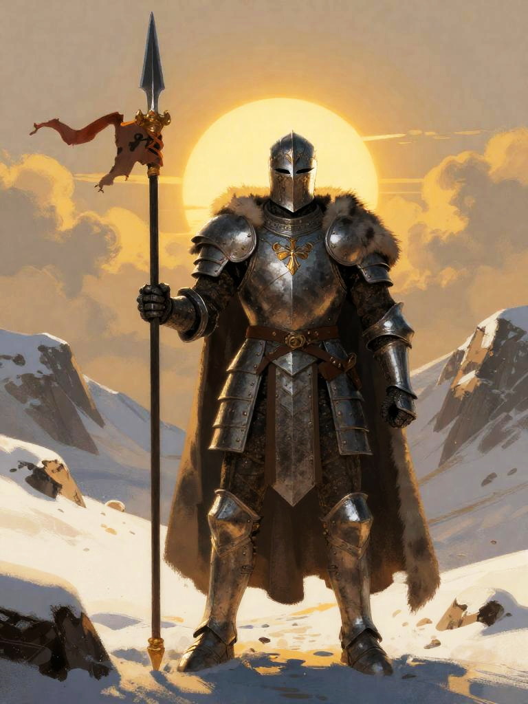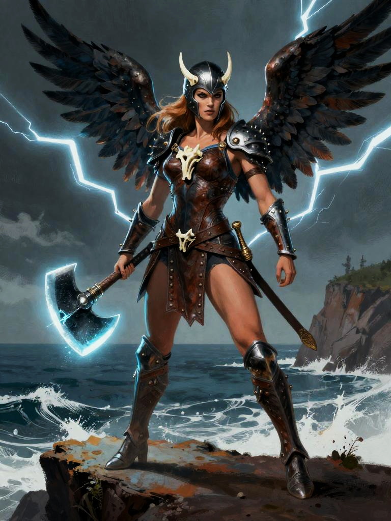 Giant-slayer warrior woman standing on burning village at dusk, wearing runed plate armor and fur cloak, wielding paired seax knives, golden sunrise breaking through clouds, epic composition, rich textured brushwork, dramatic, graphic novel illustration, 2d shaded retro comic book
