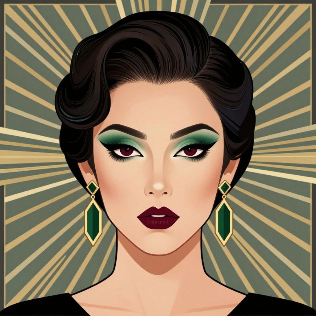 This striking digital illustration features a woman with sharp, symmetrical facial features, styled in an art deco-inspired design. Her dark hair is neatly styled, complemented by geometric earrings and bold makeup in hues of green and deep red, set against a patterned background of radiating lines that emphasize the vintage aesthetic.