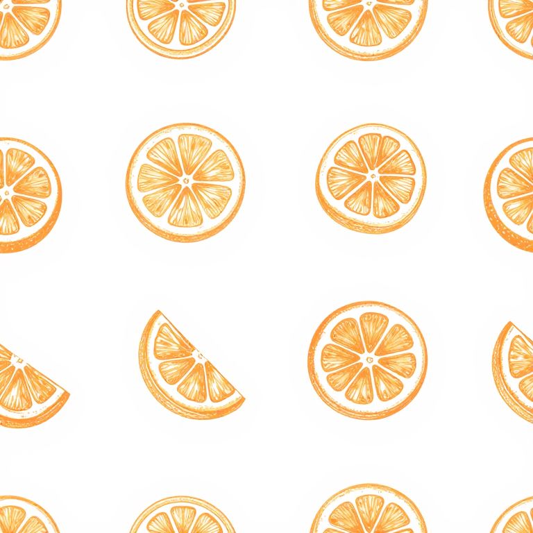 This is a digital illustration of a seamless pattern featuring orange slices on a white background. The orange slices are drawn in a realistic style with detailed, textured segments and a vibrant orange color. Each slice varies slightly in orientation, with some showing the rind and others just the flesh. The slices are evenly spaced across the image, creating a repetitive, grid-like pattern. The white background enhances the bright orange hues, making the slices stand out prominently. The overall effect is fresh and lively, evoking a sense of citrus freshness.