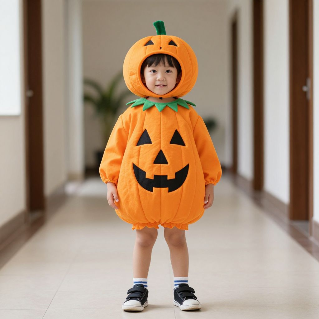 Kid Pumpkin Costume, child in a pumpkin costume standing in a hall